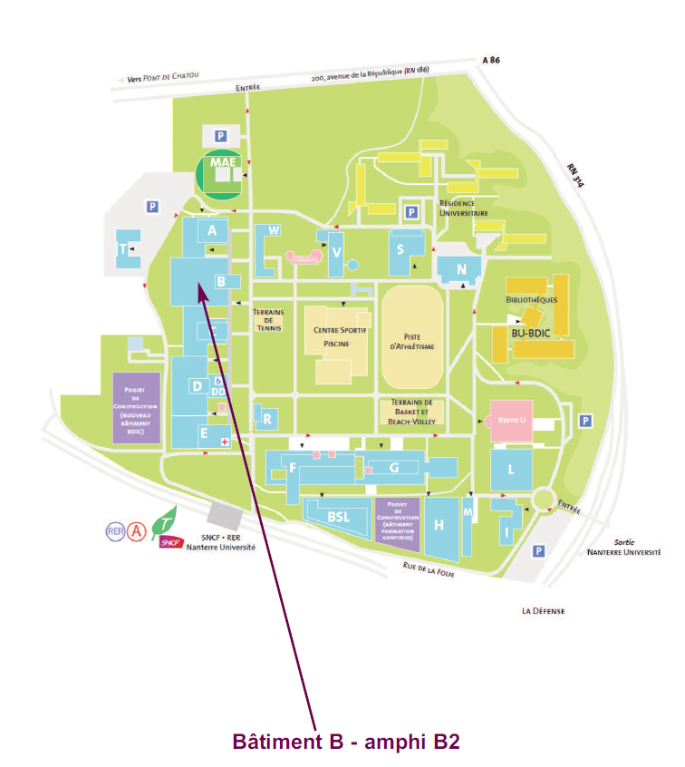 Par le RER : Prendre la ligne A du R.E.R., direction Saint-Germain-en-Laye, et descendre à la station "Nanterre-Université". De la station "Châtelet / Les Halles" ou "Auber", comptez de dix à quinze minutes de trajet.